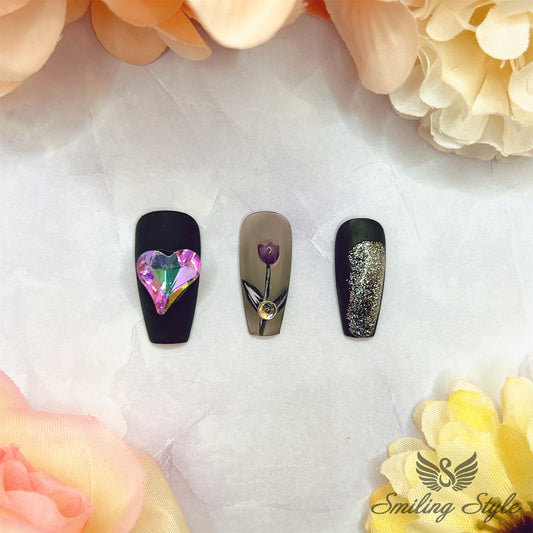Black Heart Crystal Camellias Press On Nails by SMILINGSTYLE | Luxury Fake Nails | Reusable Nails | Handmade Nails