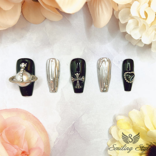 Black and Silver Queen's Mother Press On Nails by SMILINGSTYLE | Luxury Fake Nails | Reusable Nails | Handmade Nails