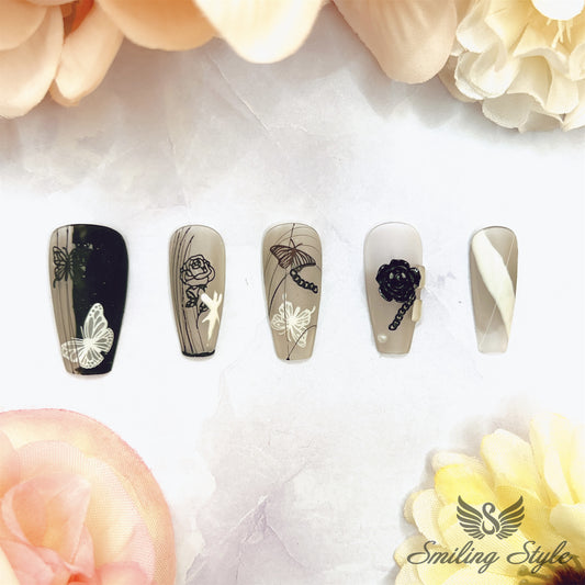 Black and White Butterfly Chain Press On Nails by SMILINGSTYLE | Luxury Fake Nails | Reusable Nails | Handmade Nails