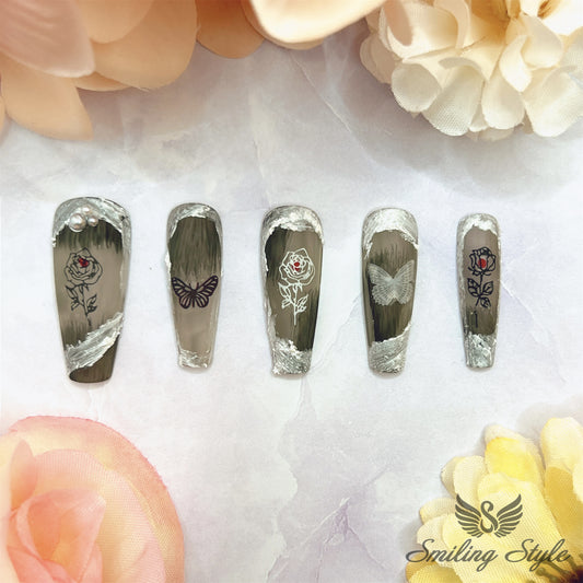 Dark Gypsum Rose and Butterfly Press On Nails by SMILINGSTYLE | Luxury Fake Nails | Reusable Nails | Handmade Nails