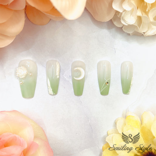 Gradient Moon Green Press On Nails by SMILINGSTYLE | Luxury Fake Nails | Reusable Nails | Handmade Nails