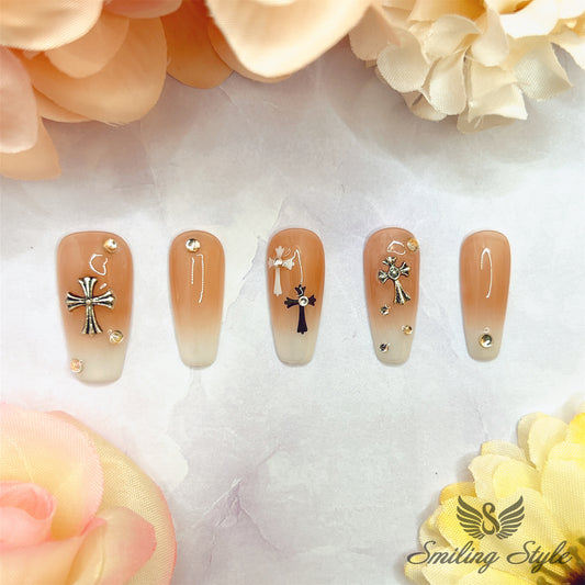 Gradient French Cross Hearts Press On Nails by SMILINGSTYLE | Luxury Fake Nails | Reusable Nails | Handmade Nails