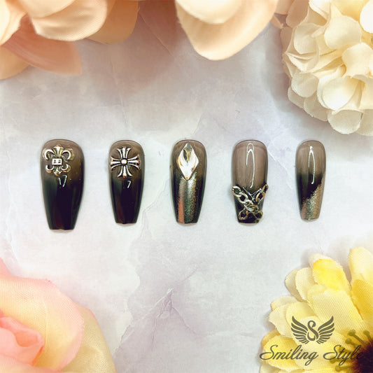 French Black Gradient with Diamonds Press On Nails by SMILINGSTYLE | Luxury Fake Nails | Reusable Nails | Handmade Nails