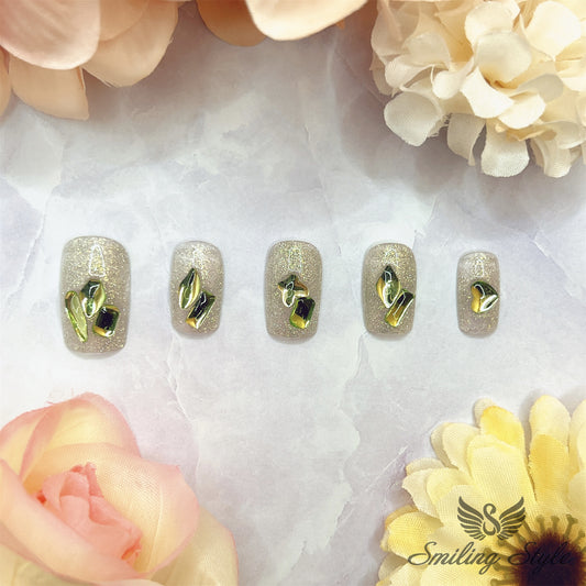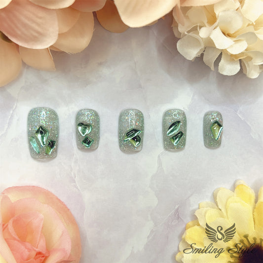 Green Grass Diamond Tears Press On Nails by SMILINGSTYLE | Luxury Fake Nails | Reusable Nails | Handmade Nails