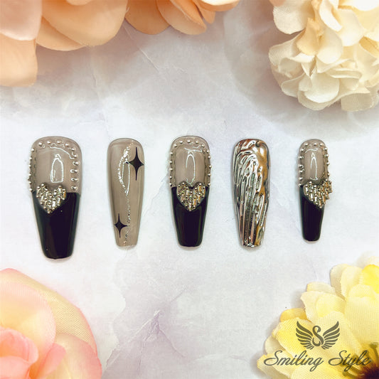 Small Black Steel Heart Ball Press On Nails by SMILINGSTYLE | Luxury Fake Nails | Reusable Nails | Handmade Nails