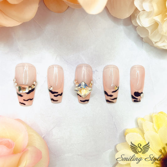 French Leopard Diamond Press On Nails by SMILINGSTYLE | Luxury Fake Nails | Reusable Nails | Handmade Nails