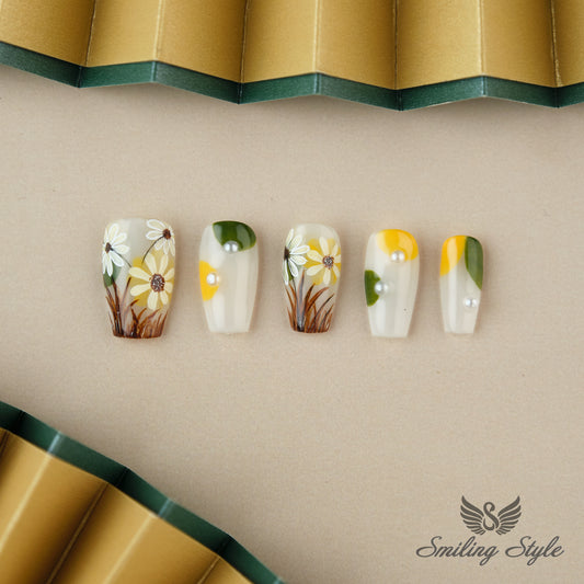 Angle under The Sunflower Press On Nails by SMILINGSTYLE | Luxury Fake Nails | Reusable Nails | Handmade Nails